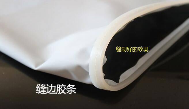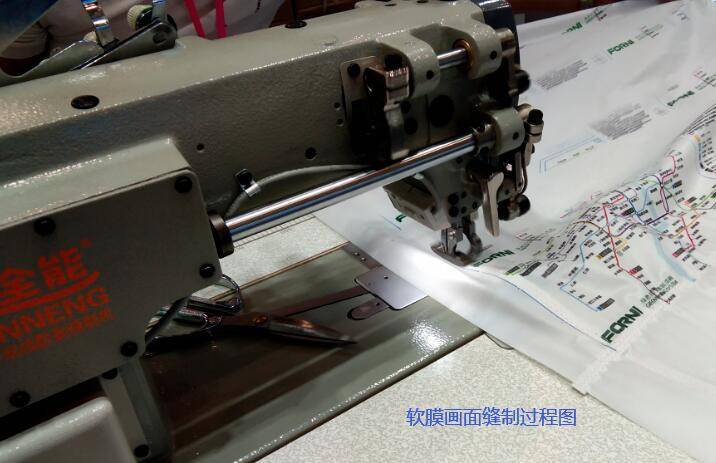 4、将软膜画面转移到缝纫机旁,将软膜画面和硅胶条在缝纫机上缝制好。