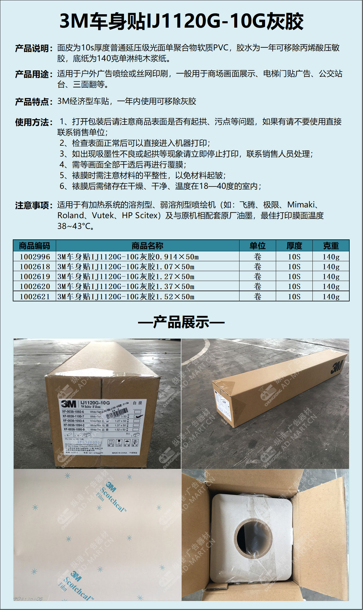 3M车身贴IJ1120G-10G灰胶 10s 140g 一年可移